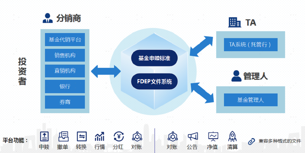 該平臺(tái)依托金融數(shù)據(jù)交換平臺(tái)(FDEP),在進(jìn)一步規(guī)范香港基金申贖業(yè)務(wù)數(shù)據(jù)標(biāo)準(zhǔn)的基礎(chǔ)上,為香港基金分銷商、基金投資人服務(wù)行(TA)和基金管理人提供靈活的IT系統(tǒng)接口和文件傳輸服務(wù),實(shí)現(xiàn)了“基金申贖電子化”和“對(duì)賬數(shù)據(jù)電子化”兩大功能,可全面支持基金申贖、撤單、轉(zhuǎn)換、行情、分紅、對(duì)賬、公告、凈值、清算等業(yè)務(wù)需要。